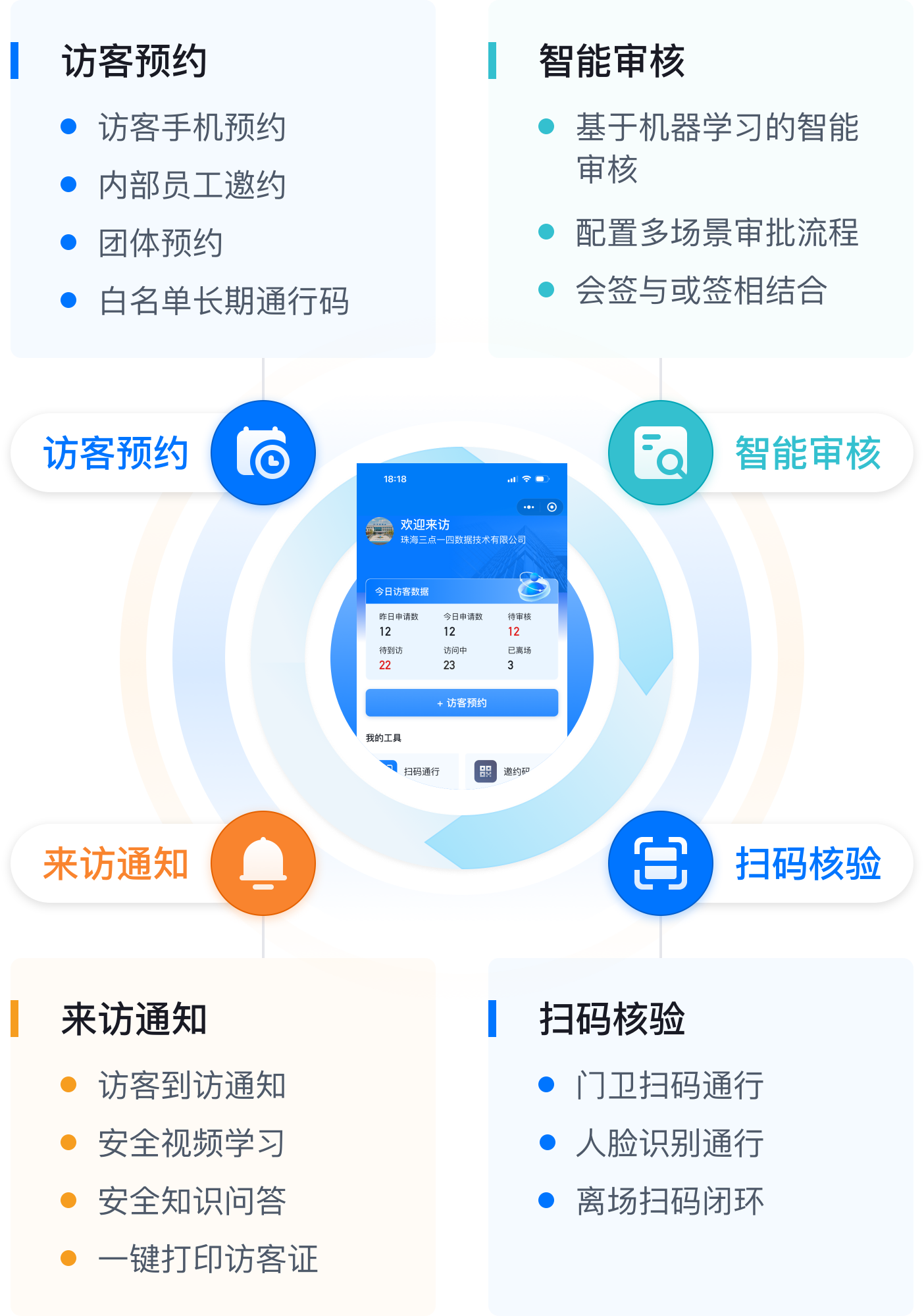 简单易用,扫码预约、发起送约、团体预约和短信预约多场景支持,轻松解决来访预约、协同审核、扫码入场、到访通知、安全学习等访客场景需求,让出入口管理变现数字化、WEB端和移动设备上实现高效的办公协同